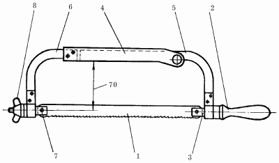Рис. 1. Ножовка ручная: 1 – полотно ножовки; 2 – рукоятка; 3 – стержень; 4 – обойма; 5,6 – правая и левая полурамки; 7 – натяжной винт; 8 – барашек.