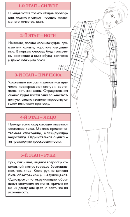 Как показывают исследования, для создания впечатления необходимо учитывать, что в бизнес-среде происходит оценка внешности по такому алгоритму: силуэт, ноги, прическа, лицо, руки. Все это автоматически отслеживает мозг самого обычного человека, а не только специалиста по имиджу. Разумеется, ухоженный вид, идеально скроенный костюм, умело подобранные аксессуары не гарантируют успеха деловых переговоров, но могут заметно повлиять на их результаты.