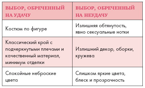 Главная опасность, которой необходимо избегать женщине при выборе делового костюма, – его гиперпровокационность. Деловой костюм демонстрирует не только финансовые возможности бизнес-леди, но и воспитание, вкус, знание делового этикета. Поэтому женщина должна всегда помнить о правиле: если занимаешься бизнесом, нужно быть готовой пойти на определенные жертвы в моде.