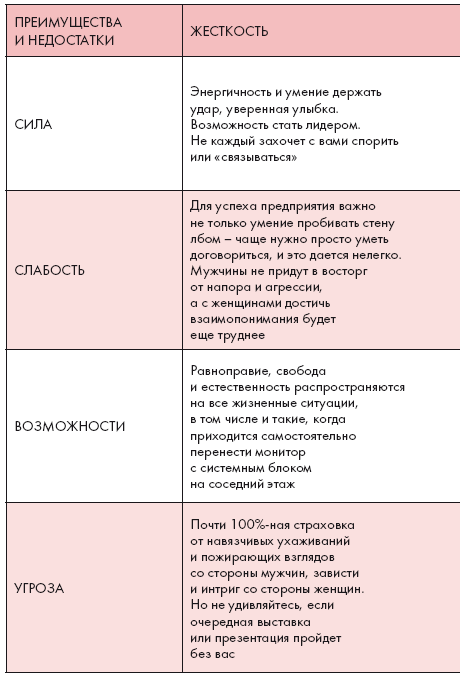 Мужчина в своем продвижении наверх использует чисто мужские качества – аналитический ум, напористость и т. д. Если говорят о профессионализме, то чаще всего употребляют прилагательное «жесткий». До недавних пор считалось, что подчеркнутая женственность призвана скрывать недостаток деловых качеств. Сегодня современная бизнес-леди с легкостью ладит с начальством и управляет подчиненными, пользуясь врожденным женским очарованием и незаурядным интеллектом. Успешная женщина почти всегда живет так, как ей удобно, но при этом старается, чтобы это удобство не мешало другим. Она трезво оценивает собственные возможности и никогда не станет взваливать на свои плечи непосильный груз обязанностей. Именно успешные люди в совершенстве владеют словом «нет», потому что уверены: куда хуже пообещать и не сделать, чем решительно отказаться. Успешные и все успевающие люди редко выглядят уставшими. Кажется, что все у них получается легко. Главный секрет успешных людей в том, что они работают с удовольствием и искренне любят свое дело – на что дело всегда отвечает взаимностью.
