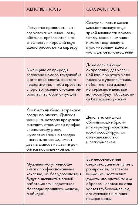 Часто глянцевые журналы для работающих женщин полны фотографий молодых привлекательных моделей в суперсовременных, но шокирующе коротких или обтягивающих костюмах, достаточно сексуальных и вызывающих. Деловые женщины знают, что слишком провокационная одежда создает одни лишь трудности, и более того – в ней можно выглядеть даже смешно.
