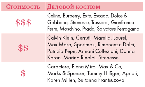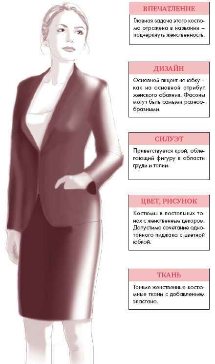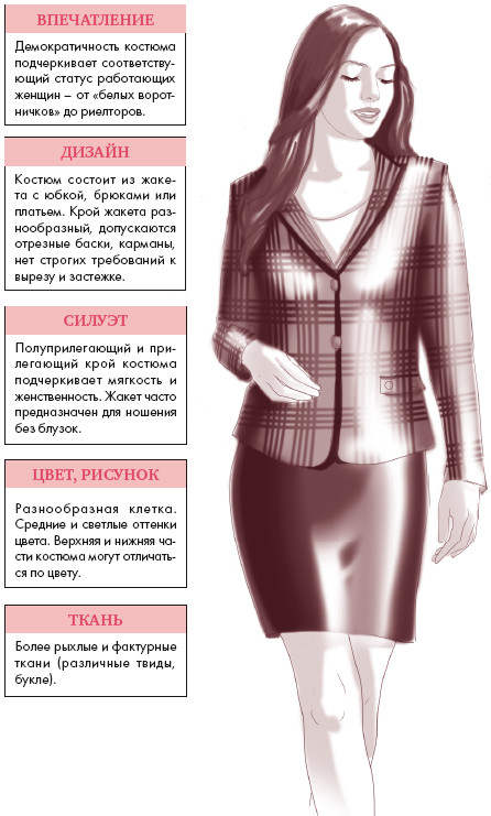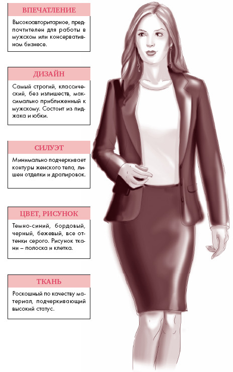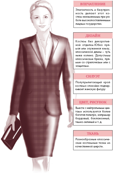 В бизнес-гардеробе существуют два основных вида костюма: официальный и неофициальный. Несмотря на то что теперь даже самые высокопоставленные люди позволяют себе приходить на встречи далеко не в формальной одежде, официальный костюм незаменим. Он помогает выдержать нужный тон переговоров. Женский деловой костюм может быть максимально консервативным или, наоборот, максимально женственным. По степени консервативности или декоративности костюмы делятся на пять основных видов: традиционный, консервативный, профессиональный, женственный, агрессивный.