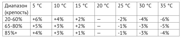 Примерная коррекция показаний спиртометра в зависимости от температуры спирта указана в таблице, расчет можно сделать по калькулятору самогонщика1 на сайте.