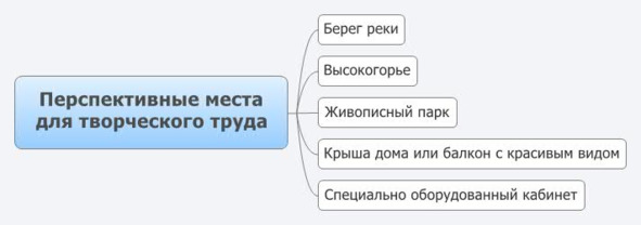 Подходящее место для размышлений и творческого труда может быть любым. Выбор удобного места очень индивидуален и зависит от личности конкретного человека. Наиболее перспективными местами для рождения новых идей и создания шедевров являются: