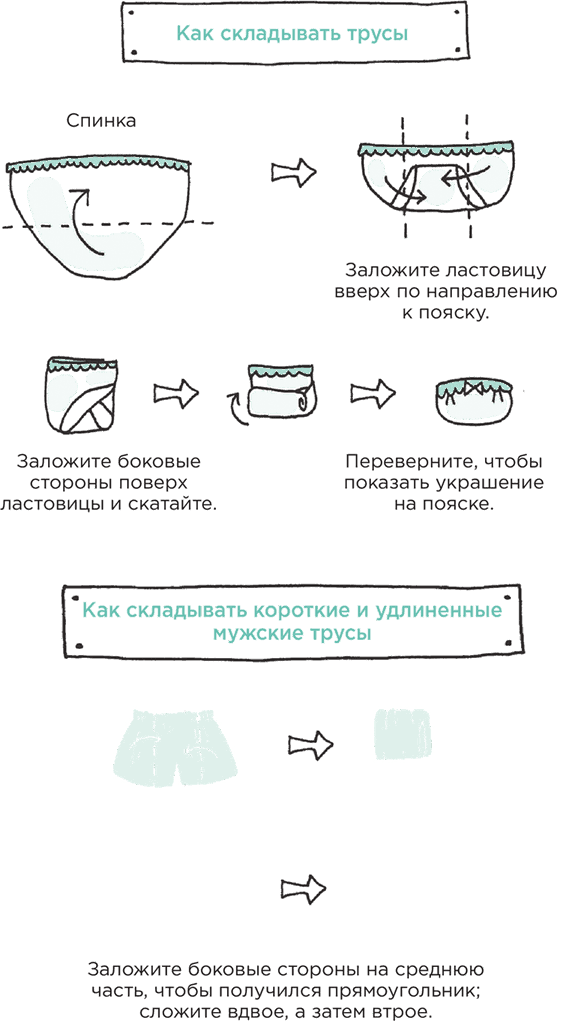 Для боксеров и коротких мужских трусов: заложите боковые стороны на среднюю часть, чтобы получился прямоугольник, затем сложите пополам, а потом втрое. Любое другое белье следует складывать и хранить как обычную одежду.