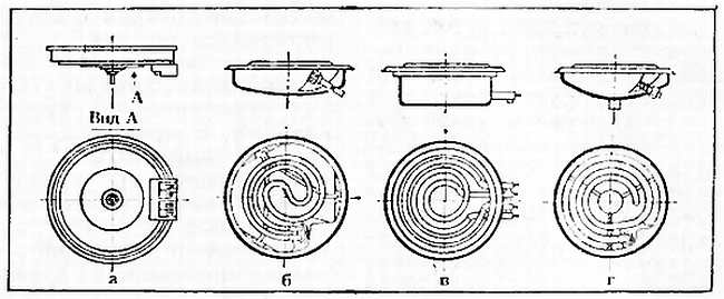 Тип конфорки, устройство регулирования мощности — основные элементы. определяющие эксплуатационные характеристики электроплиток. Время разогрева конфорок с ТЭНами 3–4 мин, их КПД — 70 %, температура нагрева поверхности — 650–700 °C, средний ресурс — 5 тыс. ч. Соответствующие характеристики штампованных конфорок: 15 мин; 55 %; 450–500 °C, 2–3 тыс. ч. Характеристики чугунных конфорок занимают промежуточные значения. Наиболее совершенными являются плитки с ТЭНами. Нагревающаяся поверхность ТЭНа — трубка из тонкого металла, благодаря чему она нагревается очень быстро, а передача теплоты происходит в основном в результате излучения. Кроме того, ТЭНы (в отличие от чугунных конфорок) не трескаются при попадании воды на их раскаленную поверхность. ТЭНы в электроплитках применяются двухконцовые односпиральные с диаметром трубок 7,4—10 мм и одноконцовые двухспиральные с диаметром 16 мм. Конструкция наиболее распространенных конфорок при ведена на рис. 23.