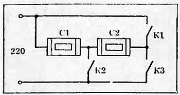 С1 и С2 — спирали, К1, К2, КЗ — контакты переключателя