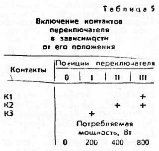 Включение контактов переключателя и мощность, потребляемая конфоркой типа ЭКЧ-145-1.0 мощностью 1 кВт, показаны на табл. 8.