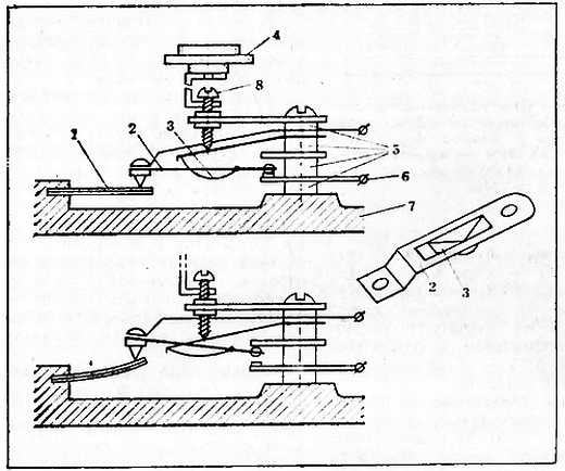 1 — биметаллическая пластина; 2 — подвижная контактная пластина; 3 — пружина подвижного контакта; 4 — ручка терморегулятора; 5 — изолирующие шайбы; 6 — пластина неподвижного контакта; 7 — подошва утюга; 8 — регулировочный винт