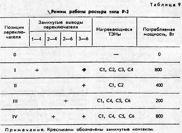 Расположение ТЭНов в наиболее распространенном ростере Р-2 и его электрическая схема приведены на рис. 28. Режим работы ростера рассмотрен в табл. 9.