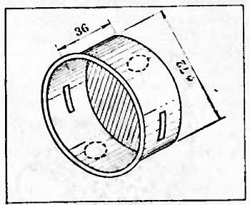 При скрытой проводке на кирпичном, шлаковом, шлакобетонном основаниях розетки и выключатели устанавливают в специальных стальных коробках (см. рис. 2), имеющих два надрубленных отверстия для зацепления распорных лапок розетки или выключателя. Наружный диаметр коробки — 72 мм, глубина — 36 мм. Коробки нетрудно изготовить из кровельного железа, жести или подходящих по размерам консервных банок. Гнезда под эти коробки сначала высверливают по периметру сверлом 6–8 мм, а затем вырубают зубилом.