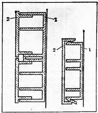В сочетании со скрытой проводкой в общественных местах жилых домов провода прокладывают в электротехнических плинтусах. Плинтус — длинный узкий пенал с рядом продольных перегородок, изготовленный из трудносгораемой пластмассы. Крышка из того же материала защелкивается на пенале его пружинящими боковыми стенками (рис. 4). Плинтусы укрепляются на стенах у пола, потолка и по периметру дверных проемов. В этих плинтусах прокладывают также телефонные линии, телевизионные кабели, сети радиотрансляции.