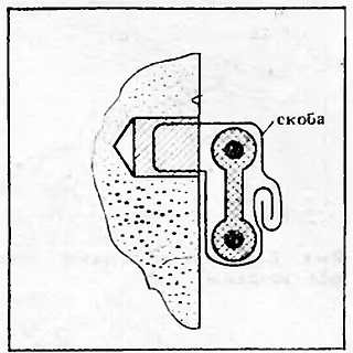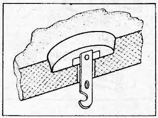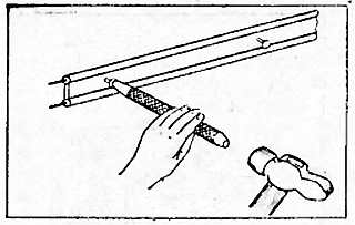 На деревянном основании провода крепятся гвоздями диаметром 1,6–1,75 мм и длиной 20–25 мм со шляпкой 3 мм. Гвозди сначала забиваются примерно на 3/4 длины, а затем при помощи оправки (рис. 7) — до касания шляпкой перемычки провода. Дли удобства на оправке делается лунка под шляпку гвоздя.