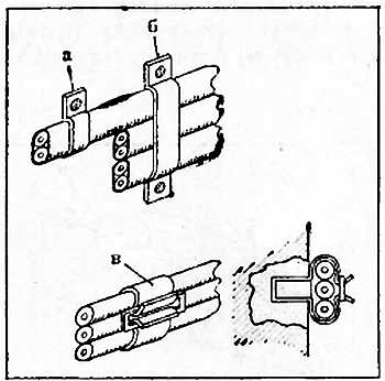 Технология прокладки электропроводки с защищенными проводами и кабелями практически не отличается от прокладки проводки с плоскими проводами. Различие лишь в способах крепления токопроводящих жил. Легкие небронированные кабели с двумя жилами крепятся к основанию металлическими скобками с одной лапкой или скобками с пряжками, а два-три параллельно идущих кабеля — скобками с двумя лапками. На бетонном или кирпичном основании скобки фиксируются шурупами, ввинчиваемыми в распорные дюбели или в металлические спирали, вмазанные в основание. На дереве скобки удерживают шурупами. Способы крепления кабелей приведены на рис. 9.