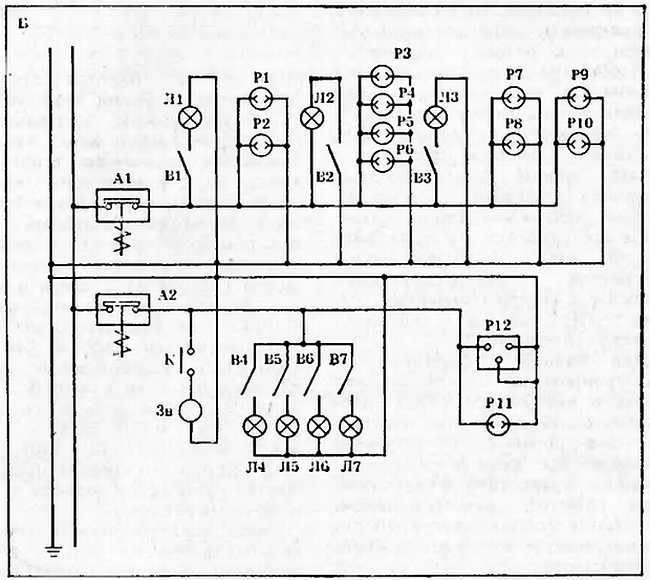 А — план расположения оконечных устройств; Б — принципиальная схема: А1, А2 — автоматические предохранители: Л1-Л7 — лампы светильников; В1-В7 — выключатели светильников; P1-Р11 — розетки; Р12 — разъем для подключения электроплиты; Зв — звонок; К — кнопка звонка