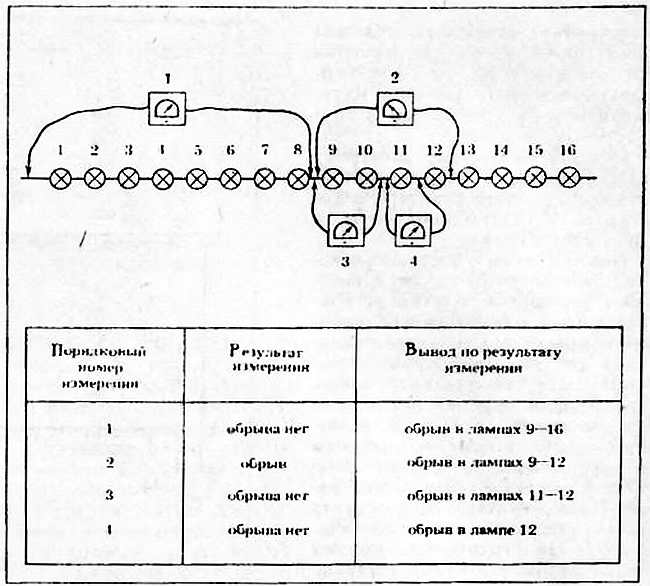 Как искать неисправность в электропроводке. Прежде чем рекомендовать методы поиска неисправностей, рассмотрим простой пример. В елочной гирлянде последовательно включены 32 лампочки. Как за минимальное время найти перегоревшую, если их цветные колбы не прозрачные? При последовательной проверке каждой лампочки в худшем случае придется сделать 31 измерение. Такой метод поиска будет самым длительным. Рассмотрим другой метод, заключающийся в делении всей гирлянды на 2 равные по числу ламп группы, определении группы с перегоревшей лампой путем проверки группы в целом, очередном делении уменьшившейся группы на 2 части и т. д. до нахождения перегоревшей лампы. Этот принцип будет оптимальным, так как где бы ни находилась перегоревшая лампа, мы найдем ее в нашей гирлянде максимум за 5 измерений, в гирлянде из 16 ламп — за 4 измерения (рис. 12). Этот простой пример показывает преимущество системного подхода к поиску неисправности.