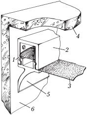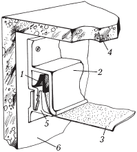 Рис. 243. Гарпунный способ крепления натяжного потолка: 1 — гарпун; 2 — багет; 3 — полотно потолка; 4 — основной потолок; 5 — декоративная накладка; 6 — стена