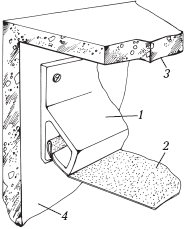 Рис. 245. Клипсовый метод крепления натяжного потолка: 1 — клипса; 2 — полотно потолка; 3 — стена; 4 — основной потолок